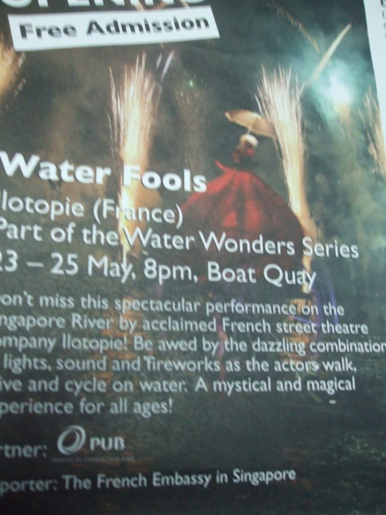 For example, in conjunction with the 30th year anniversary of the Arts Festival, “Water Fools” was brought to the opening ceremony of the festival. It is a non-ticketed event which took place at the Singapore River, Boat Quay on 23rd -25th May, 8pm sharp. In addition, it is a performance which took place on the water performed by Ilotopie (France). It is part of the water wonders series where performers actually performed on the water surface which creates an illusion that the performers were standing on the water surface. Its spectacular performance gained numerous praises and is recognised by the public. With the first performance being such a success, the public will then continue to look forward to the other performances and events.