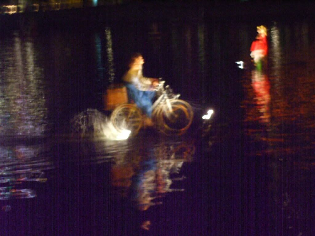 Performers riding a bicycle on the water surface